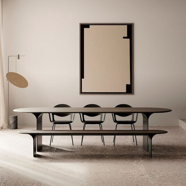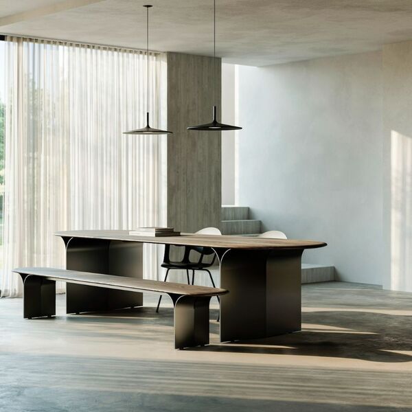Un banc en bois et métal qui n'a pas besoin de table pour exister. Il tient seul, par la justesse de ses proportions et la force tranquille de ses pieds en arc. Mais placé face à la table de la même collection, il complète le dialogue — même rythme, même langage, même main.