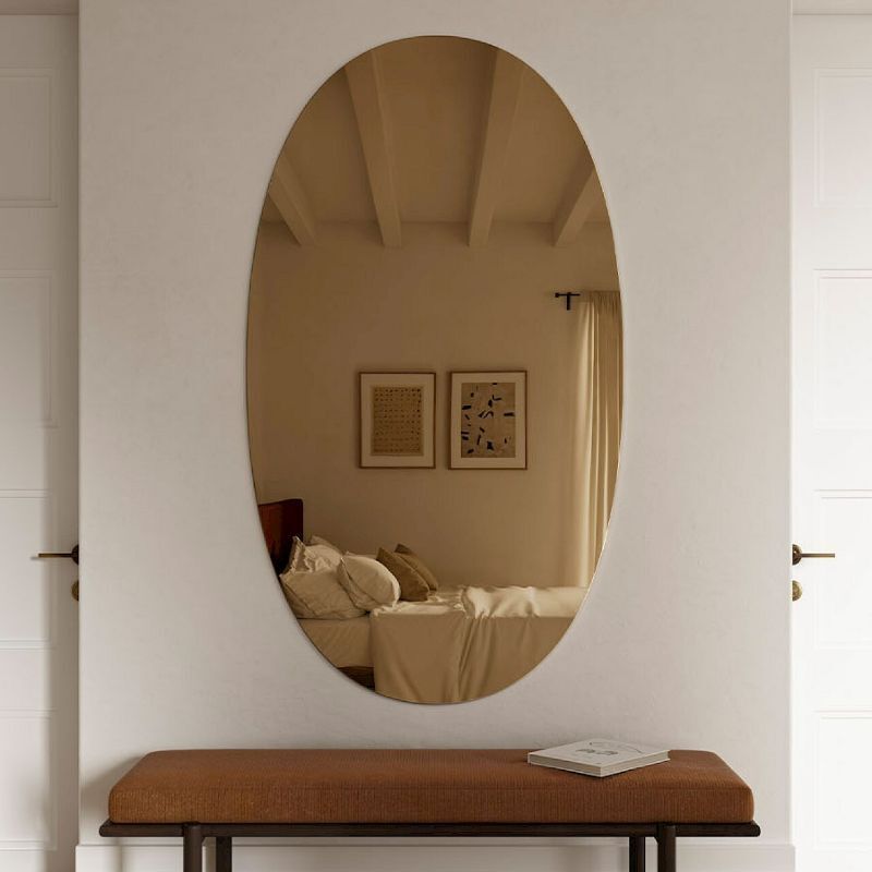 "Sans cadre, ce miroir design ovale flotte sur votre mur comme une fenêtre vers la lumière."