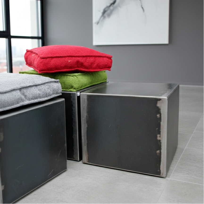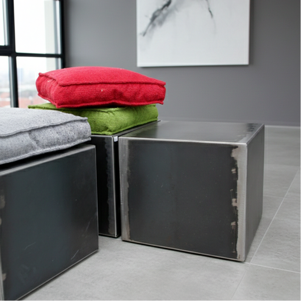Ce pouf métal est original de par l'unicité de chaque tôle d'acier brut utilisée. Réalisée de manière artisanale, ce cube métal peut aussi servir de table basse métal d'appoint ou de bout de canapé.